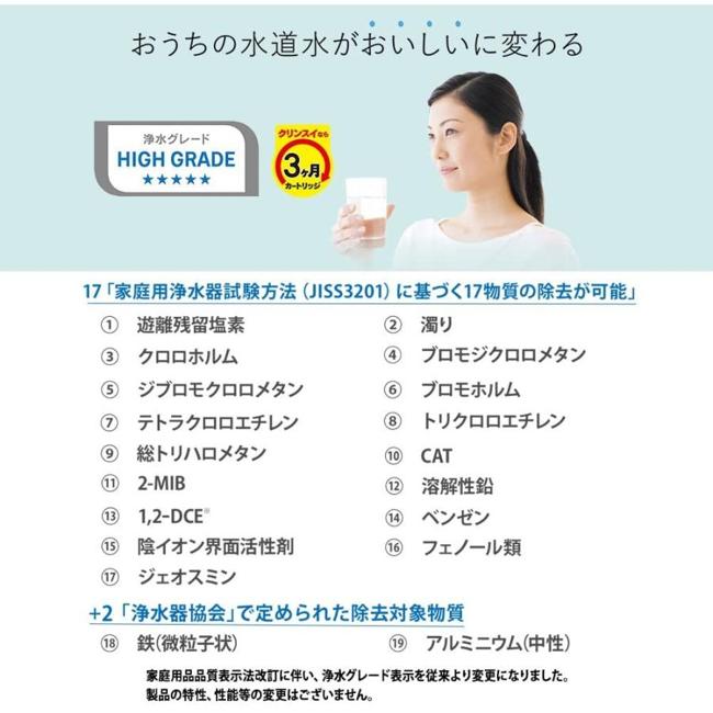 ★たっぷり使えて経済的な蛇口直結型デザイン浄水器MONOシリーズ用カートリッジ●カートリッジの汚れがひと目でわかるチェックウインドー付き●ワンタッチで取り外しが簡単■除菌力:クリンスイなら中空糸膜フィルターで除菌が出来ます。さらに微粒子などの濁りや赤サビまで除去します。■ろ材の種類:中空糸膜(ポリエチレン)、活性炭+セラミック■ろ過流量:1.6L/分■浄水能力:遊離残留塩素、濁り、クロロホルム、ブロモジクロロメタン、ジブロモクロロメタン、ブロモホルム、テトラクロロエチレン、トリクロロエチレン、総トリハロメタン、2-MIB(カビ臭)、CAT(農薬)、溶解性鉛、1,2-DCE※、ベンゼン、陰イオン界面活性剤、フェノール類、ジェオスミン(カビ臭)、鉄(微粒子)、アルミニウム(中性)※シス-1,2-ジクロロエチエン及びトランス-1,2-ジクロロエチレン■ろ材の取換時期の目安:3ヶ月(1日10L使用した場合)■パッケージサイズ:60×60×104mm■対応機種:MD301・MD201・MD101・MD102・MD103・MD111