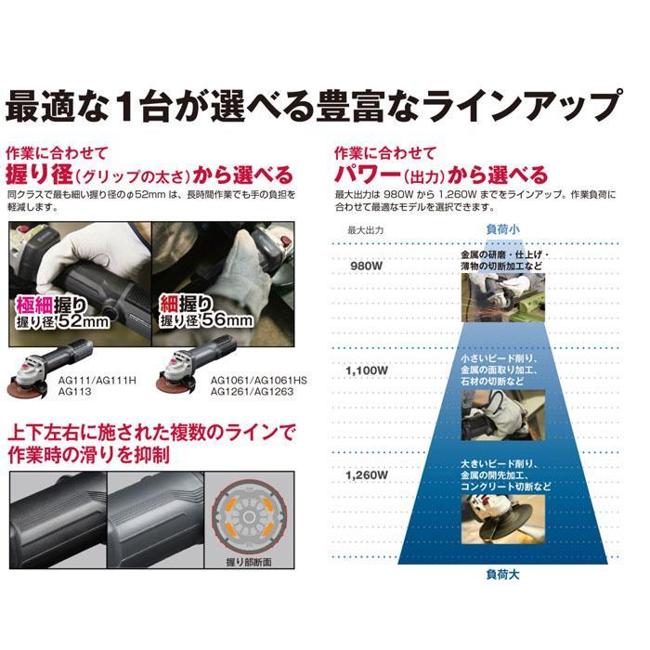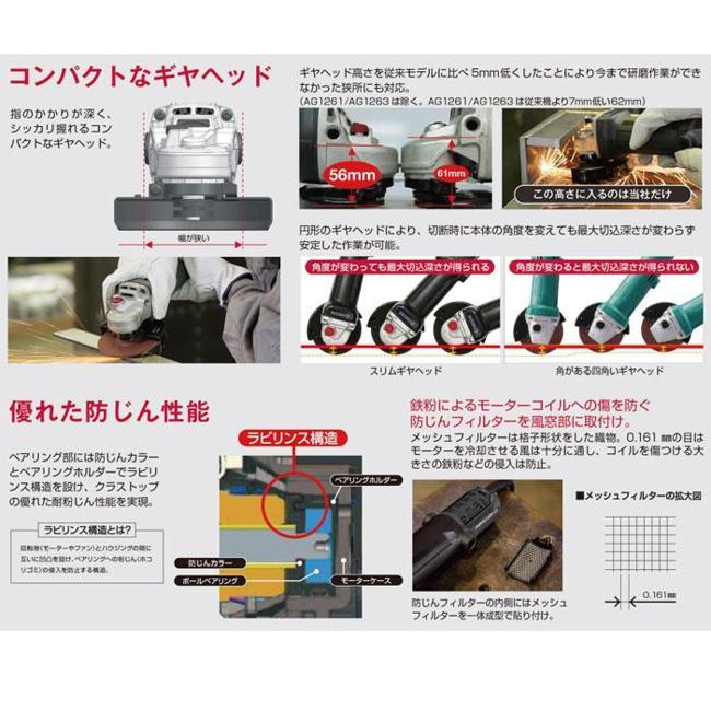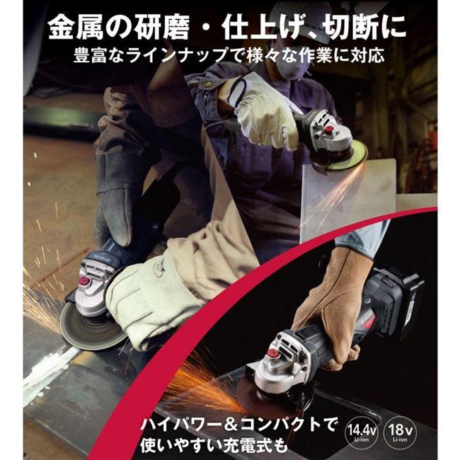 100V並みのパワーを実現!φ58mmの握り径と後部を絞り込んだ握りやすいグリップ形状切断時に切り込み深さを一定に保てる丸形スリムギヤヘッド本体の異常をLEDでお知らせする安心保護機能付優れた防じん性能※充電器・電池パック・キャリングケースは付属していません。本体サイズ(全長×全高×全幅):約307×122×117mm重量:約2.1kg握り径:58mm砥石径:(外径)100mm×(内径)15mm回転数:10000min-1