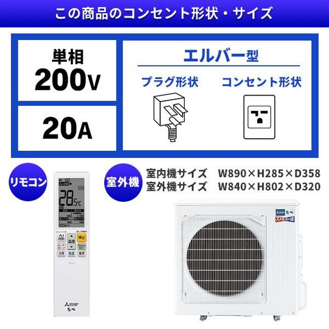 | 室内機サイズ | 幅890x高さ285x奥行358(363)mm ()内の寸法は、据付板を付けたときの寸法です。 | 室外機サイズ | 幅840(+62)x高さ802x奥行320(+56)mm ()内の寸法は、サービスパネルおよび脚部の突出し寸法です。 |