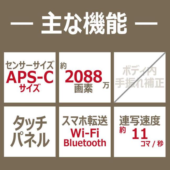 | 画素数 | 2151万画素(総画素) 2088万画素(有効画素) | 撮像素子 | APS-C 23.5mm×15.7mm CMOS |