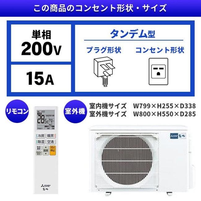 | 室内機サイズ | 幅799x高さ255x奥行338(343)mm ()内の寸法は、据付板を付けたときの寸法です。 | 室外機サイズ | 幅800(+62)x高さ550x奥行285(+60)mm ()内の寸法は、サービスパネルおよび脚部の突出し寸法です。 |