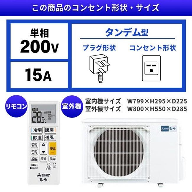 | 室内機サイズ | 幅799x高さ295x奥行225(230)mm ()内の寸法は、据付板を付けたときの寸法です。 | 室外機サイズ | 幅800(+62)x高さ550x奥行285(+60)mm ()内の寸法は、サービスパネルおよび脚部の突出し寸法です。 |