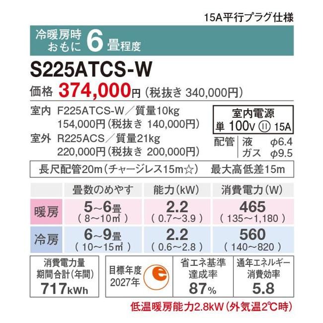 | 低温暖房能力 | 2.8 kW | 暖房消費電力 | 465W |
