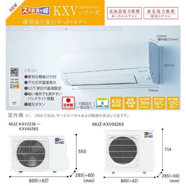 | 室内機サイズ | 幅799x高さ295x奥行230(235)mm ()内の寸法は、据付板を付けたときの寸法です。 | 室外機サイズ | 幅800(+62)x高さ550x奥行285(+60)mm ()内の寸法は、サービスパネルおよび脚部の突出し寸法です。 |