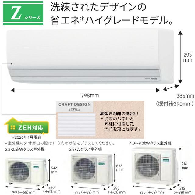 | 室内機サイズ | 幅798x高さ293x奥行385mm | 室外機サイズ | 幅799x高さ542x奥行290mm |