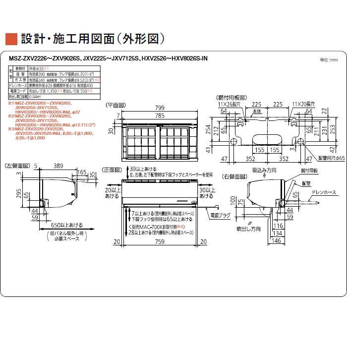 | 室内機サイズ | 幅799x高さ295x奥行389(394)mm ()内の寸法は、据付板を付けたときの寸法です。 | 室外機サイズ | 幅800(+62)x高さ714x奥行285(+60)mm ()内の寸法は、サービスパネルおよび脚部の突出し寸法です。 |