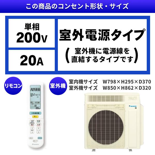 | 室内機サイズ | 幅798x高さ295x奥行370mm | 室外機サイズ | 幅850(+89)x高さ862x奥行320(+66)mm ()内は突起物の寸法です。 |