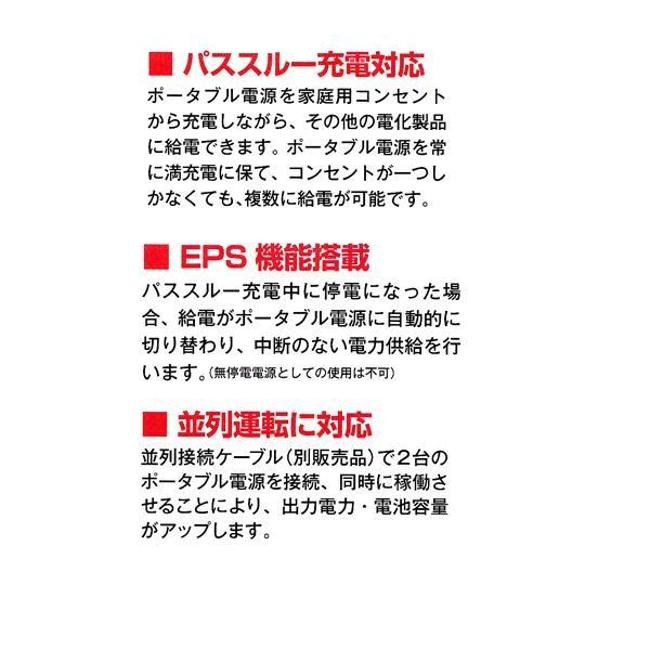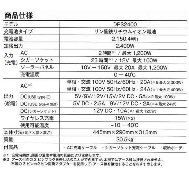 | AC | 単相・交流100V 50/60Hz 20A×6 最大2000W 単相・交流100V 50/60Hz 24A×1 最大2400W | USB | USB-A(急速):5V/2.5A、9・12V/2A×4 最大24W USB-C:5・9・12・15・20V/5A×2 最大100W |