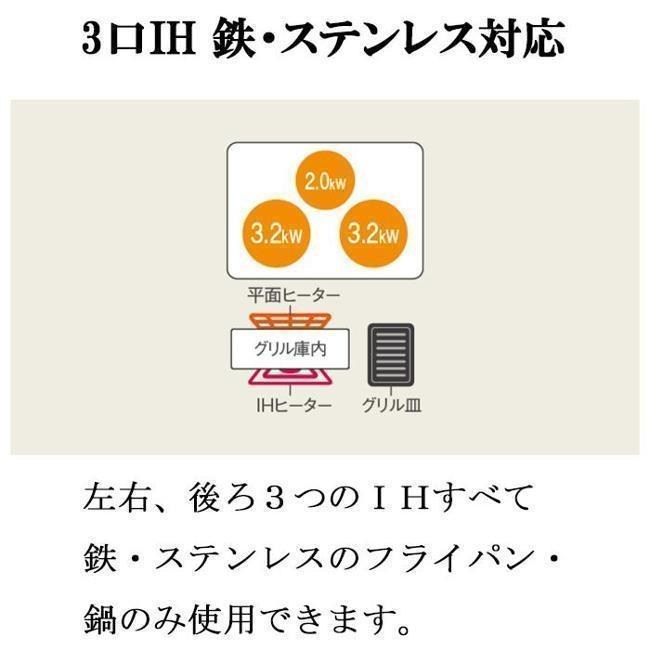 | 火力調整 | 左右IH:10段階 後ろIH:8段階 グリル(手動):3段階 | クイックラジエントヒーター | |