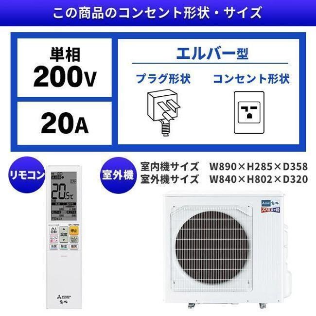 | 室内機サイズ | 幅890x高さ285x奥行358(363)mm ()内の寸法は、据付板を付けたときの寸法です。 | 室外機サイズ | 幅840(+62)x高さ802x奥行320(+56)mm ()内の寸法は、サービスパネルおよび脚部の突出し寸法です。 |