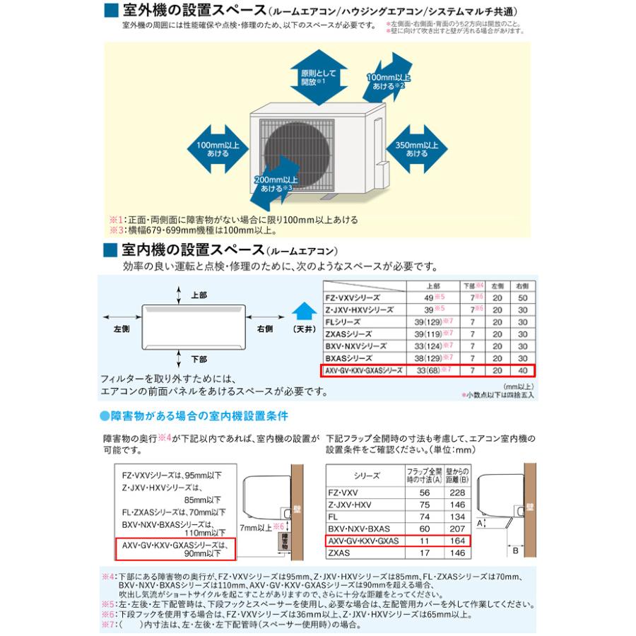 | 室内機サイズ | 幅799x高さ295x奥行230(235)mm ()内の寸法は、据付板を付けたときの寸法です。 | 室外機サイズ | 幅679(+55)x高さ453x奥行249(+36)mm ()内の寸法は、サービスパネルおよび脚部の突出し寸法です。 |