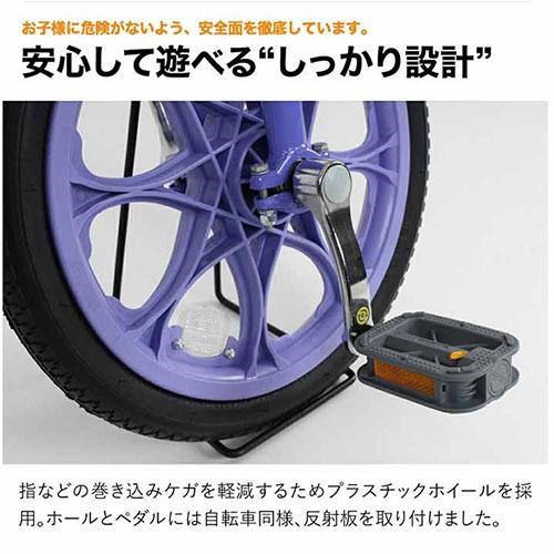 指などの巻き込みケガを軽減するためプラスチックホイールを採用。ホールとペダルには自転車同様、反射板を取り付けました。